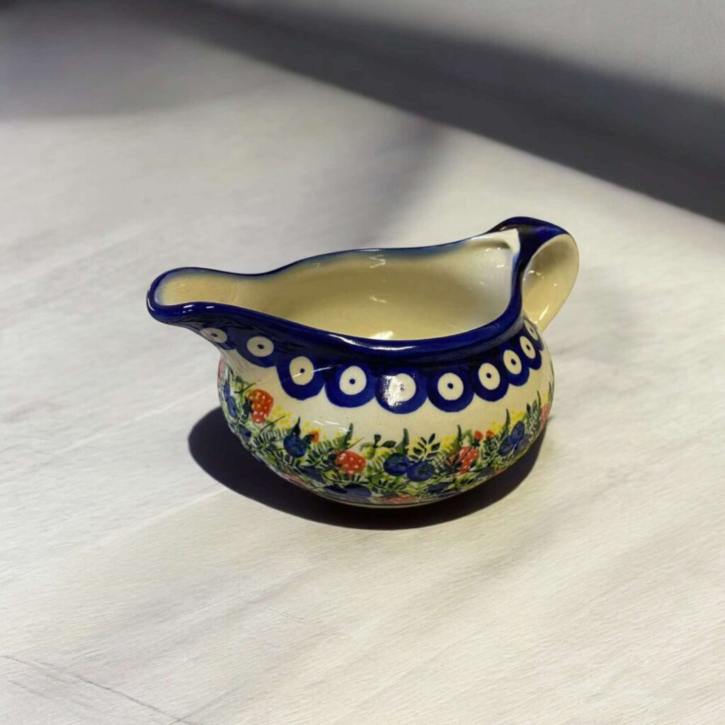 Oryginalna Ceramika Bolesławiecka zdobiona ręcznie za pomocą stempli i pędzli. Sosjerka idealnie sprawdzi się do podawania sosów.  Z pewnością przyozdobi każde wnętrze domu. Pomimo swojego klasycznego wyglądu, pięknie prezentuje się również w nowoczesnych wnętrzach. Świetnie sprawdzą się przy codziennym użytkowaniu. Wszystkie wyroby ceramiczne naszej produkcji mogą być jak najbardziej używane w piekarnikach, kuchenkach mikrofalowych, zmywarkach i lodówkach do przechowywania żywności. Gwarantujemy pełne bezpieczeństwo w kontakcie z żywnością ze względu na brak szkodliwych substancji. Dzięki warstwie szkliwa oraz bardzo wysokim temperaturom wypalania, jest niezwykle trwała, odporna na odpryski oraz zarysowania. Wszystkie nasze wyroby wykonujemy sami od podstaw, dlatego możemy zagwarantować, że każdy etap produkcji przeszedł prawidłowo i na najwyższym poziomie. Farby, których używamy są ekologiczne i nie zagrażają środowisku, barwniki nie są testowane na zwierzętach. W naszej ofercie posiadamy różnorodność kształtów i wzorów.  Zapraszamy do pozostałych aukcji.
